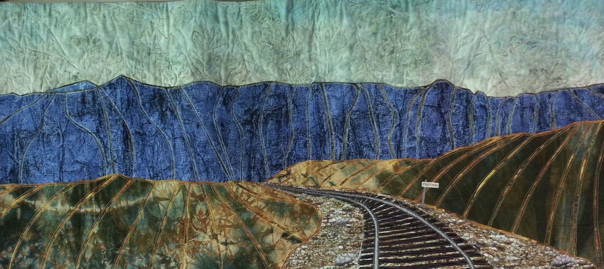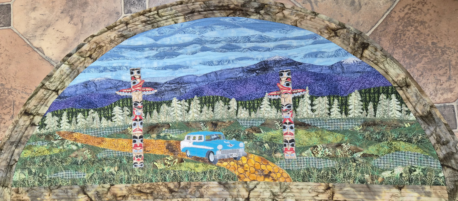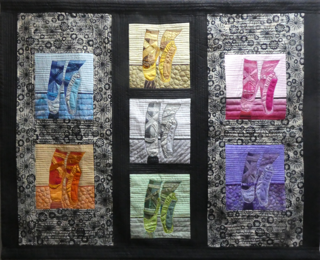 Created during Covid. I was faced with an assignment in my online art class. We were to draw a pair of toe shoes from an image our instructor provide. The urge to reproduce them in fabric overtook me and at my husband's suggestion I created them in a rainbow of colours.